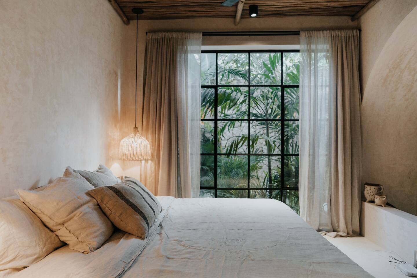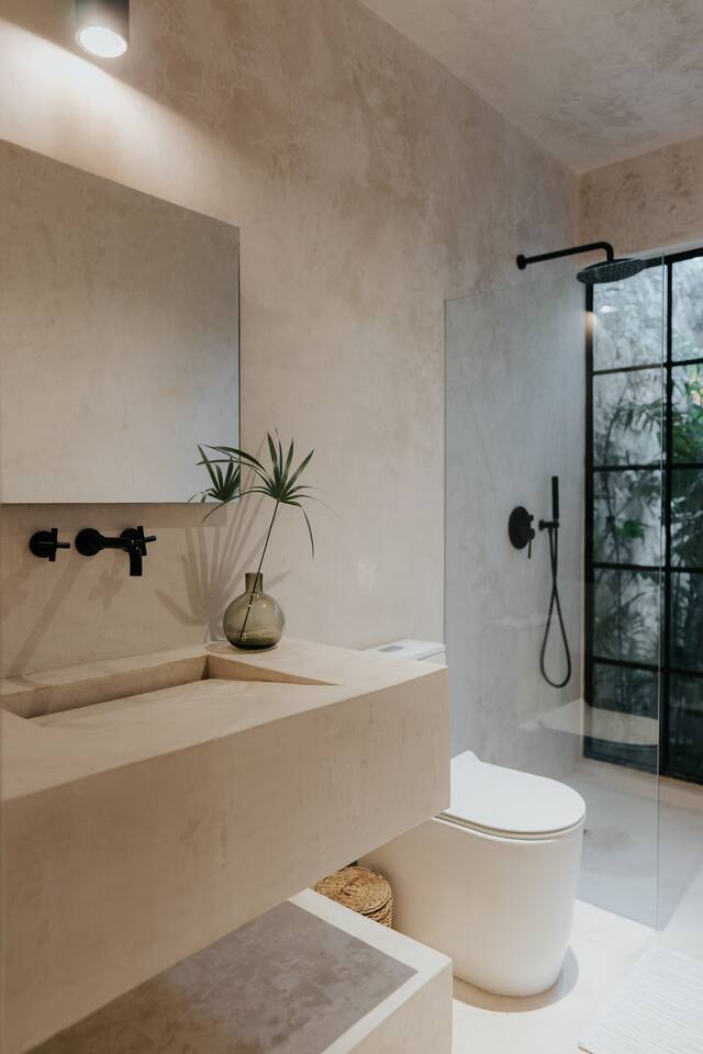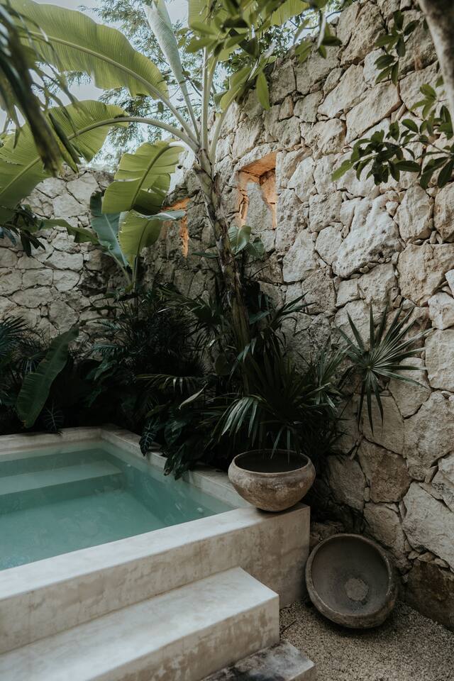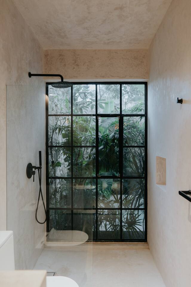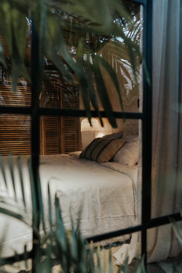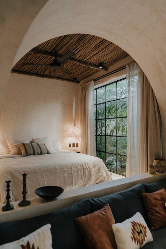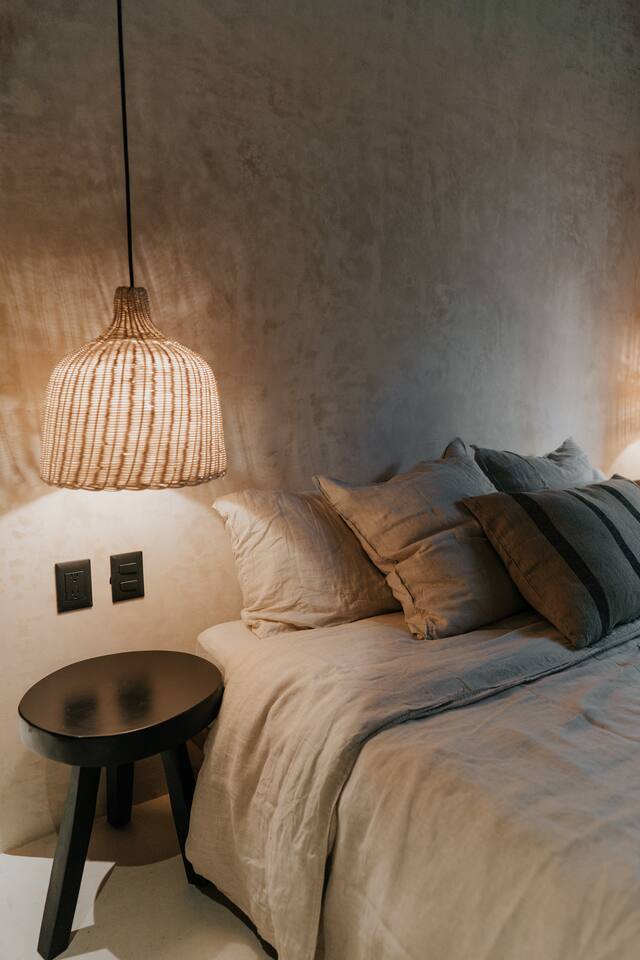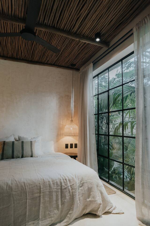 Este Apartamento de Diseño se encuentra en un edificio especialmente diseñado y es completamente privado. La calidad y los detalles hacen que este lugar sea muy especial; la decoración, los muebles y el equipamiento son de alta gama. El edificio cuenta con un área de lobby sombreada por un gran y hermoso árbol y fuentes de agua. Hay personal de seguridad las 24 horas para que tu estancia sea segura y cómoda. La cocina está completamente equipada y ofrece las siguientes características: Estufa eléctrica de 4 quemadores, microondas, refrigerador grande, grifo de cocina de alta gama, cafetera, juegos grandes de ollas y sartenes, platos de diseño hechos a mano (grandes, medianos y pequeños), tazas de café hechas a mano, copas de vino, tostadora. El lugar cuenta con lavadora y secadora. Además, te ofrecemos una bolsa de playa y toallas de playa. El dormitorio cuenta con ropa de cama de lino, cortinas de lino, diseño hermoso y elegante, grandes espejos y muebles de diseño. Los baños cuentan con regaderas tipo lluvia, shampoo, acondicionador y jabón corporal de calidad, toallas grandes y cómodas. Cada baño tiene un gran espejo. El área exterior sorprende con una gran piscina y una exuberante vegetación; hay una hermosa zona de estar con una pérgola impermeable, iluminación acogedora y el sonido de una cascada. Este patio es privado y solo accesible desde el estudio.